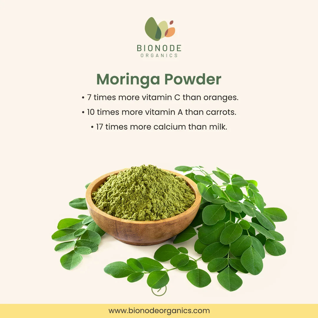 Introducing Bionode Organics’ certified organic Moringa powder, meticulously derived from the leaves of the Moringa oleifera tree cultivated in certified organic farms. Revered in Ayurveda for centuries, Moringa holds significant importance as a versatile herbal remedy and nutrient powerhouse. Bursting with benefits, Moringa powder is rich in vitamins (such as vitamin A, C, and E), minerals (including calcium, iron, and potassium), antioxidants, and essential amino acids. Its therapeutic effects encompass immune support, energy boost, blood sugar regulation, and overall vitality. Certified organic and free from synthetic substances, our Moringa powder embodies the purity and potency of nature. Embrace holistic well-being naturally with Bionode Organics’ premium Moringa powder, your ultimate source of vitality and rejuvenation.